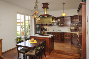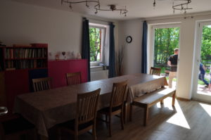 Der Klassenraum, den sich früher alle Klassen der ehemaligen Dorfschule teilen mussten, dient heute als Wohn- und Esszimmer. Trotz seiner Größe ist der Raum sehr gemütlich und der zentrale Treffpunkt der Gruppe. Dazu trägt auch der Kamin und die direkte Nähe der Küche bei.