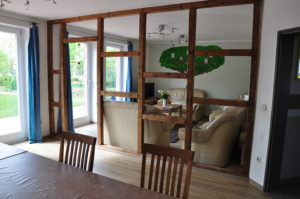 Der Klassenraum, den sich früher alle Klassen der ehemaligen Dorfschule teilen mussten, dient heute als Wohn- und Esszimmer. Trotz seiner Größe ist der Raum sehr gemütlich und der zentrale Treffpunkt der Gruppe. Dazu trägt auch der Kamin und die direkte Nähe der Küche bei.